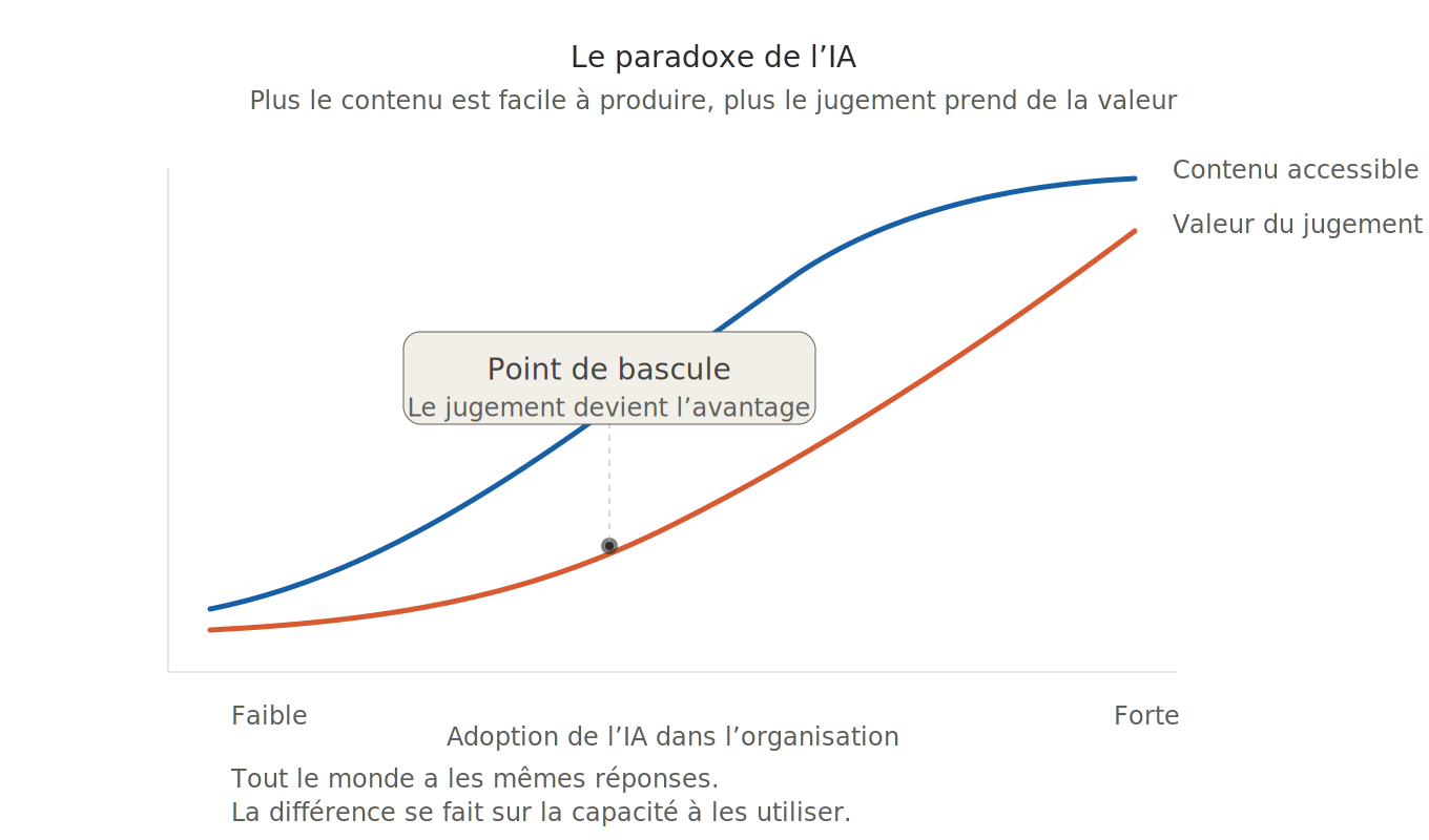 On arrive à un paradoxe intéressant. Plus l'IA rend le contenu facile à produire, plus la capacité humaine de juger ce contenu devient rare et précieuse. Plus tout le monde a accès aux mêmes réponses instantanées, plus la différence se fait sur la profondeur de compréhension qui permet de poser les bonnes questions, de repérer les failles, et d'agir avec discernement.