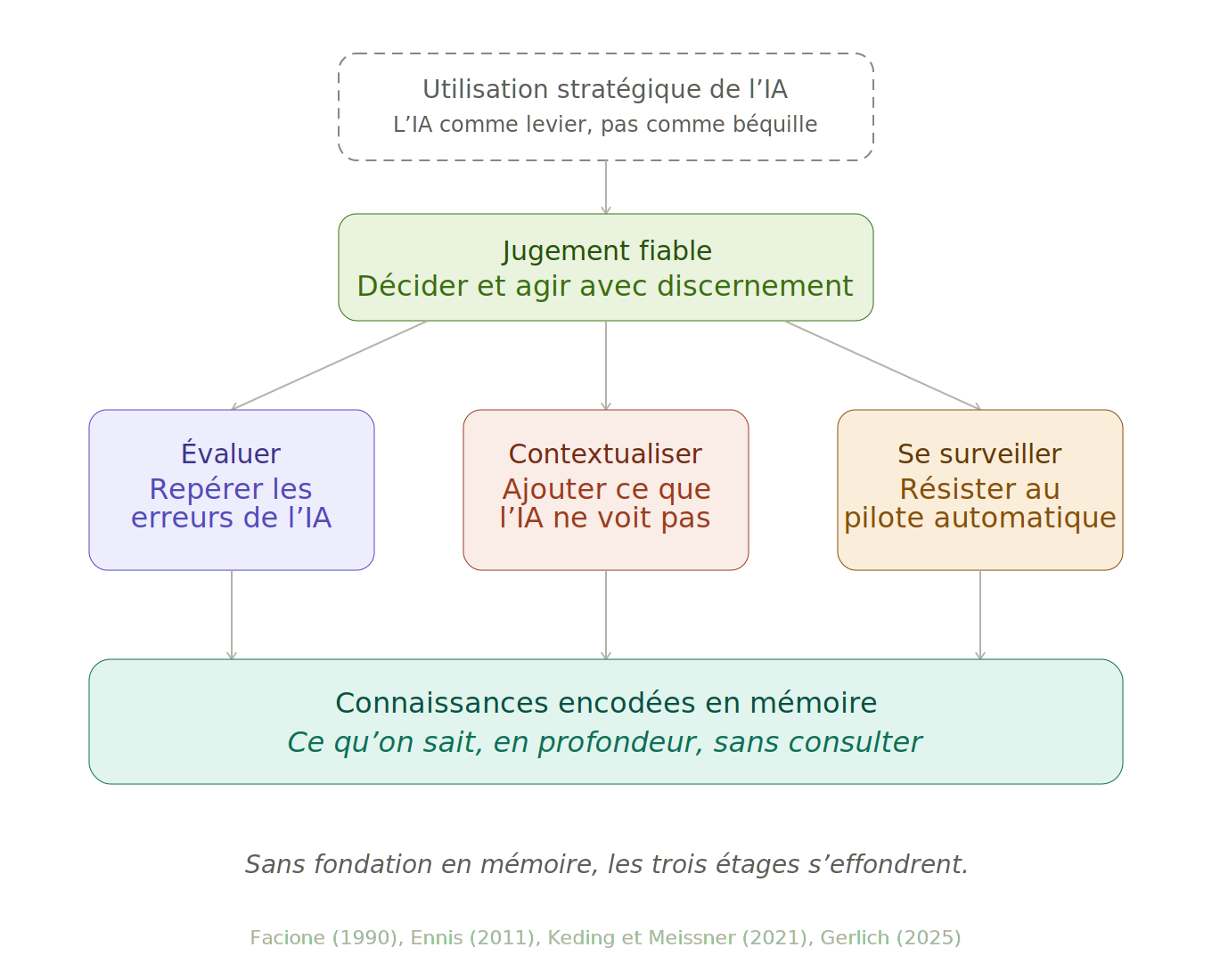 Et quand on regarde ce que la pensée critique exige concrètement face à l'IA, on comprend vite pourquoi la mémoire est non négociable. La recherche en sciences cognitives identifie trois capacités interdépendantes, et chacune dépend directement de ce qu'on a en mémoire.