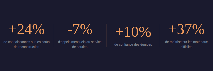 Et les résultats, après trois mois, parlent d'eux-mêmes. Les connaissances sur les coûts de reconstruction ont augmenté de 24%. La part des appels au soutien liés à ce sujet est passée de 18% à 11%, d'environ un appel sur cinq à près d'un sur dix. La confiance des équipes a grimpé de 10%. Et sur certains matériaux particulièrement difficiles à évaluer, la maîtrise a bondi jusqu'à 37%.